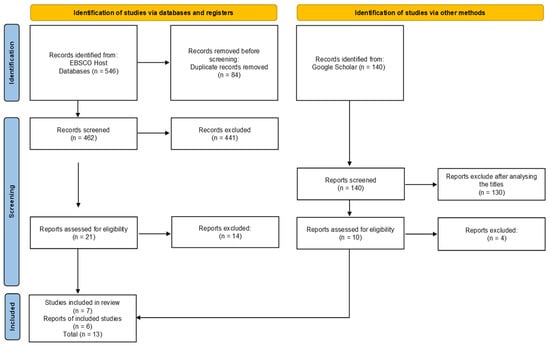 In Google academic, 140 studies were identified, and after the analysis of the titles, only 10 were left for further analysis. After the full reading of the studies, six were selected to be part of this review; so, in total, 13 studies were included.