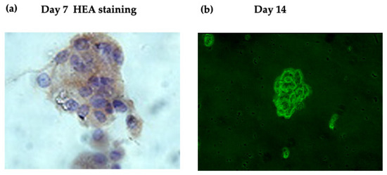 Representative images of the short-term CTC cell culture. (a) Cytospin image. Positive staining for Human Epithelial Antigen (HEA) was observed in cell clusters on day 7. (b) Phase contrast image of cell clusters on day 14 using a green filter [7].