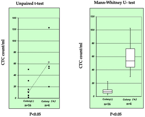 Colony formation by 4 out of 20 samples. The number of samples was too small for a definite evaluation; however, a high CTC count/mL (anti-HEA) was associated with colony formation (an unpaired t-test and the Mann–Whitney U test < 0.05) [7].