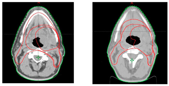The decrease of the tumor volume during HNC radiotherapy was demonstrated by Burela et al., which showed that the reduction in the planning target volume (PTV) after four weeks of radiotherapy was 13.16%, while the parotid glands decreased in volume by 27.31% and 24.63%, respectively [4]. Bhide et al. reported a reduction in the clinical target volume (CTV) after each of the first four weeks of treatment, and they concluded that the largest reduction in absolute mean volume was 21.6 cm3, representing 10.5% of CTV between week 0 and week 2 of radiotherapy [5].