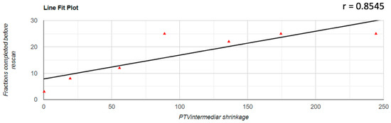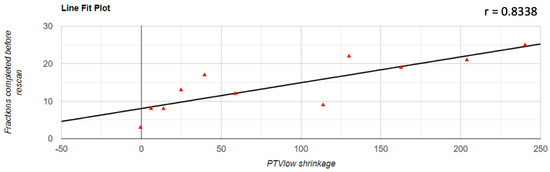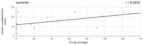 Regarding the correlation between the decrease of the PTV volume and the number of fractions completed before the replanning was performed, it was found that there was a positive correlation in all three cases; for PTVlow and PTVintermediate, this correlation was a very strong one (PTVlow: r = 0.833; PTVintermediate: r = 0.854; PTVhigh: r = 0.531). The representation of these correlations is found in Figure 3, Figure 4 and Figure 5.