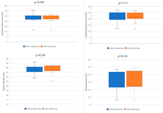 The most common organs at risk involved in HNC radiotherapy were analyzed dosimetrically, including the parotid glands, the spinal cord, and the brainstem. For all the analyzed organs, a reduction in the final dose received after replanning was found, lower than that expected at the initial scan (Table 5). Even if the values obtained after replanning were lower, these decreases were not statistically significant (ipsilateral parotid: p = 0.180; contralateral parotid: p = 0.223, spinal cord: p = 0.248; brainstem: p = 0.116). The comparative illustrations of the dosimetric differences obtained for the OARs before and after replanning are shown in the box plot diagrams (Figure 6).