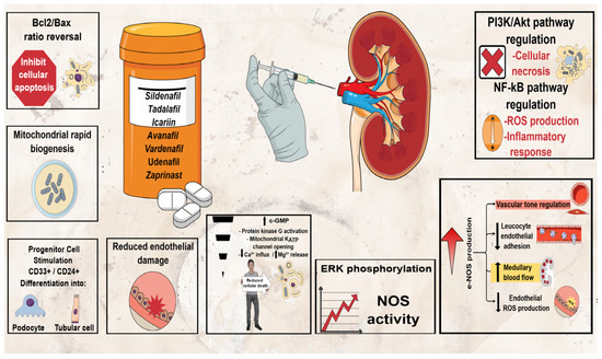 - Georgiadis, G.; Zisis, I.-E.; Docea, A.O.; Tsarouhas, K.; Fragkiadoulaki, I.; Mavridis, C.; Karavitakis, M.; Stratakis, S.; Stylianou, K.; Tsitsimpikou, C.; et al. Current Concepts on the Reno-Protective Effects of Phosphodiesterase 5 Inhibitors in Acute Kidney Injury: Systematic Search and Review. J. Clin. Med. 2020, 9, 1284. [Google Scholar] [CrossRef]