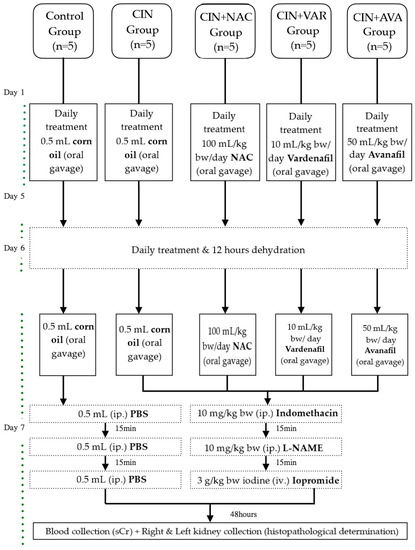 CIN was induced as per our preceding protocols [21,22]. Briefly, on day 6, the animals were prevented from water consumption for 12 h in order to induce dehydration. On day 7, following the daily oral gavage, the animals from CIN, CIN+VAR, CIN+AVA, and CIN+NAC groups were injected intraperitoneally with an inhibitor of prostaglandin synthesis (indomethacin (Sigma-Aldrich, USA); 10 mg/kg bw) dissolved in phosphate buffered saline (PBS). After 15 min, the experimental groups received an inhibitor of nitric oxide (NO) synthesis (L-NAME (Sigma-Aldrich, USA); 10 mg/kg bw) dissolved in PBS intraperitoneally. After another 15 min, the experimental groups received iopromide (Ultravist 300 mg iodine per mL, Bayer Pharma, AG, Leverkusen, Germany, 3 g/kg bw iodine), injected in the tail vein within 10 min under light 3% sevoflurane anesthesia (Sevorane, Abbvie Deutschland GmbH & Co. KG, Wiesbaden, Germany). The control group received an identical quantity of PBS, following each stage of the CIN induction experimental process. At the beginning of the treatment and prior to sacrification, animals were weighed. All reagents used and the study experimental designs are summarized in Figure 2.