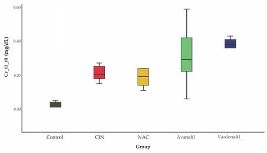 Variation of sCr levels at 24 h after CM exposure, no statistically significant difference among groups (ANOVA; n = 5 animals per group).