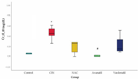 Variation of sCr levels at 48 h after CM exposure, *: statistically significant difference in CIN group compared to control, #: statistically significant difference in CIN+AVA group compared to CIN (ANOVA; n = 5 animals per group).