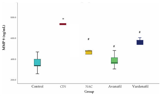 MMP-9 levels. Comparison of treatment groups with control and CIN at 48 h after CM exposure (at sacrification). *: statistically significant difference in CIN group compared to control, #: statistically significant difference in all treatment groups compared to CIN (ANOVA; n = 5 animals per group).