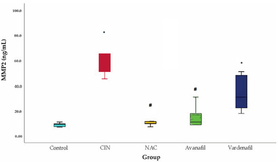 MMP-2 levels. Comparison of treatment groups with control and CIN at 48 h after CM exposure (at sacrification), *: statistically significant difference in CIN, CIN+VAR groups compared to control, #: statistically significant difference in CIN+NAC, CIN+AVA groups compared to CIN (ANOVA; n = 5 animals per group).