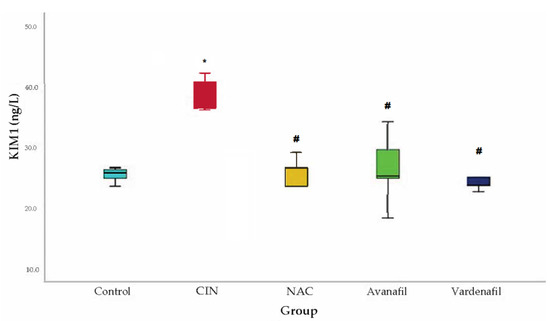 KIM-1 levels. Comparison of treatment groups with control and CIN at 48 h after CM exposure (at sacrification), *: statistically significant difference in CIN group compared to control, #: statistically significant difference in all treatment groups compared to CIN (ANOVA; n = 5 animals per group).