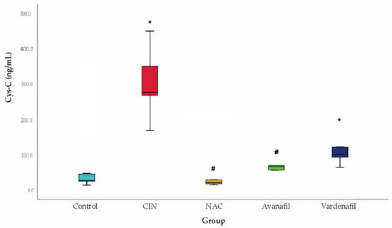 Cys-C levels increased significantly in CIN group compared to the control group. Regarding the treatment groups, Cys-C levels increased too compared to control, but the difference reached statistical significance only for CIN+VAR (p = 0.02) group. Cys-C levels increased in CIN group compared to CIN+NAC, CIN+VAR and CIN+AVA groups, however the difference was significant only for CIN+NAC (p < 0.001) and CIN+AVA (p = 0.02) groups (Figure 8).