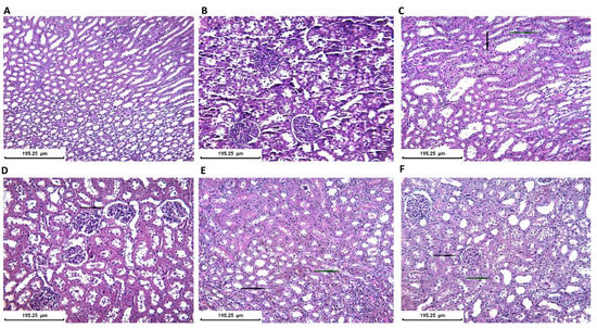 Histopathological kidney evaluation in all groups (Staining H&E): (A) Control group. Normal kidney aspect-tubular/medullar level. ×200; (B) Control group. Normal kidney aspect-glomerular/cortex level (×200); (C) CIN group. Tubular injury with moderate degeneration with granular cytoplasm (black arrow) and hypertrophic or hyperchromic nuclei (blue arrow) (×200); (D) AVA group. Enlargement of subcapsular space (black arrow) and minimal tubular architectural distortion (×200); (E) VAR group. Minimal tubular injury with medullar hemorrhagic foci (black arrow) and hyperemia (blue arrow) (×200); (F) NAC group. Cortex with normal glomerular aspect (black arrow) and minimal medullar injury with vacuolar degeneration in some tubules (blue arrow) (×200).