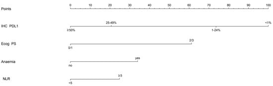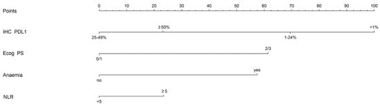 Finally, the present work provides a nomogram with a visual method to predict response, progression at 6 months, and death at 6 and 12 months from immunotherapy start that may be useful to tailor treatments according to patient characteristics and easily usable in daily clinical practice. The strength of this nomogram resides in the prompt availability of the selected variables, where other available instruments chose indicators of limited use in clinical practice. In particular, anemia was never included among the variables analyzed [,]. To date, a recent work reported a prognostic score for ICI in patients with advanced lung cancer (EPSILoN); the selected variables were ECOG PS, smoker status, presence of liver metastases, LDH, and NLR value. The combination of these variables divides patients into three groups with different prognoses [].