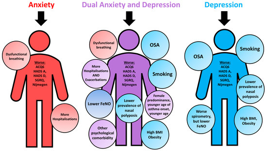 When compared to controls, there were significantly more females amongst patients with dual anxiety and depression. Additionally, these patients were significantly younger, exhibited higher BMIs and exhibited an earlier asthma onset (Table 1). Obesity, other psychological comorbidities (not anxiety or depression, e.g., post-traumatic stress disorder, obsessive—compulsive disorder, personality disorders, schizophrenia), dysfunctional breathing, OSA and smoking were also significantly more common in dual-disease patients (Table 1). However, nasal polyposis was significantly less common in this group.