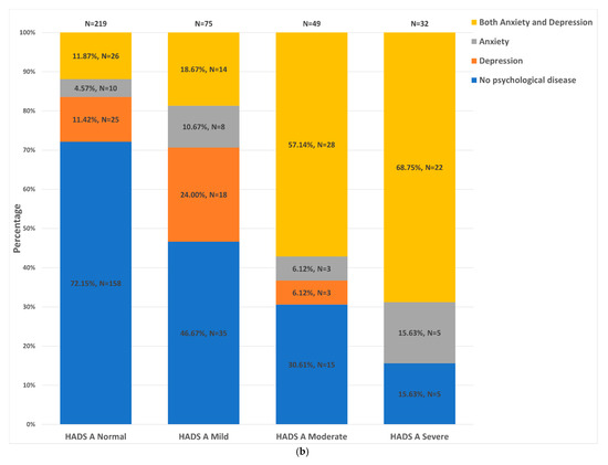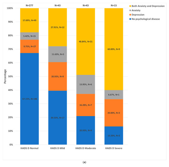 - In patients with the associated psychological comorbidity, the HADS-A (anxiety) and -D (depression) scores were utilised to stratify and characterise patients based on their self-reported severity of psychological distress [17]. The HADS cut-offs used were normal (0–7), mild (8–10), moderate (11–14) and severe (≥15) [17];
