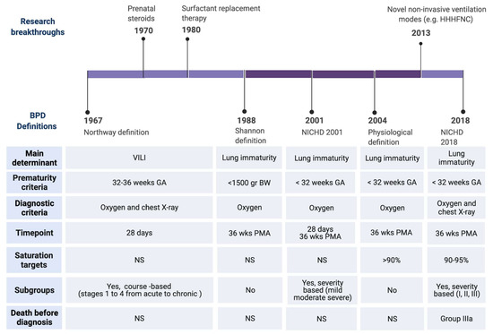 Timeline of BPD definitions. Upper: Major clinical breakthrough that have influenced the change of BPD definitions. Lower: Major differences among the definitions. Abbreviations: Heated, humidified, high flow nasal cannula (HHHNC), National Institute of Child Health and Human Development (NICHD), ventilator induced lung injury (VILI), birth weight (BW), gestational age (GA), post-menstrual age (PMA). Created with BioRender.com, [10,11,12,13,14,16,17,18].