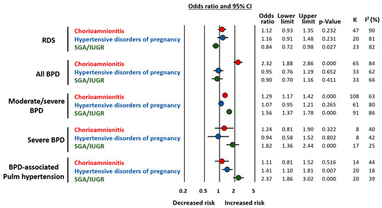 In addition to differences in GA, our meta-analyses also showed that chorioamnionitis was associated with higher rates of antenatal corticosteroids [47] and that HDP was associated with higher frequencies of female fetuses [48]. These two factors may modulate the role of the endotype on the development of respiratory complications [49,50,51] and require further investigation. Finally, we also analyzed the association of chorioamnionitis, HDP, and SGA/IUGR with the risk of developing respiratory distress syndrome (RDS). It is noteworthy that both chorioamnionitis and placental dysfunction have been considered as inducers of an early-protection, late-damage effect. This is a reduction in RDS but an increase in BPD [34,35]. Although very limited by the heterogeneity in both the statistical and clinical definitions of RDS, our results suggest that the lower incidence of RDS is observed only in the SGA/IUGR group [47,48] (Figure 3).