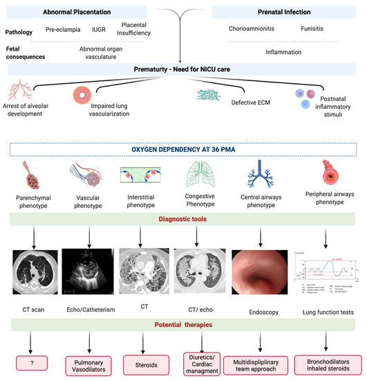Diagnostic and therapeutic perspectives on phenotypes of bronchopulmonary dysplasia. Abbreviations: intrauterine growth restriction (IUGR), extra-cellular matrix (ECM), computed tomography (CT). Created with BioRender.com.