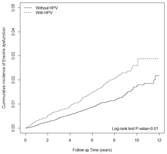The finding that HPV infection is associated with higher ED risks was shown in the survival analysis, in which the cumulative incidence of ED for the HPV cohort was higher than that for the non-HPV cohort (log-rank test, p < 0.001) (Figure 1).