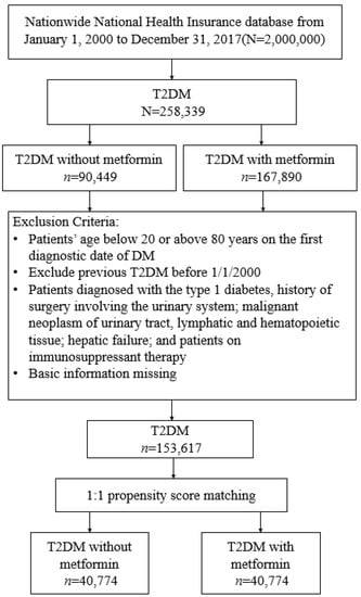 We identified patients with newly diagnosed type 2 diabetes mellitus (T2DM) between 1 January 2000 and 31 December 2017, and followed them up to 31 December 2018. Diagnosis of T2DM was based on ICD codes (ICD-9 code: 250, except 250.1×; ICD-10: E11. Table S1) for at least 3 outpatient visits or one hospitalization record. The algorithm of using ICD codes to define T2DM was validated by a Taiwan-based study with an accuracy of 74.6% [16]. Patient exclusion criteria (Figure 1) were as follows: (1) missing age or sex data; (2) aged below 20 years or above 80 years; (3) diagnosis of type 1 diabetes, hepatic failure, or history of surgery involving the urinary system; malignant neoplasms of the urinary tract, lymphatic, and hematopoietic tissue; incident dialysis; (4) history of immunosuppressant therapy; (5) the glucagon-like peptide 1 agonists were introduced in 2011, and the sodium-glucose cotransporter 2 inhibitors were launched in Taiwan in 2016. Because the number of patients using these two drugs is very small in the investigated database, we excluded patients using these drugs in this study, or with (6) prior diagnosis of T2DM before 1 January 2000, to exclude prevalent T2DM cases.
