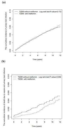 Cumulative incidences of (a) urinary tract infection (UTI), (b) death due to UTI or sepsis, for metformin users vs. metformin nonusers.