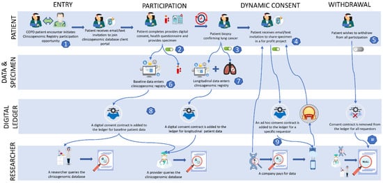 Schematic diagram of the patient and data journey in an idealized clinicogenomic database administered on a digital-blockchain ledger.