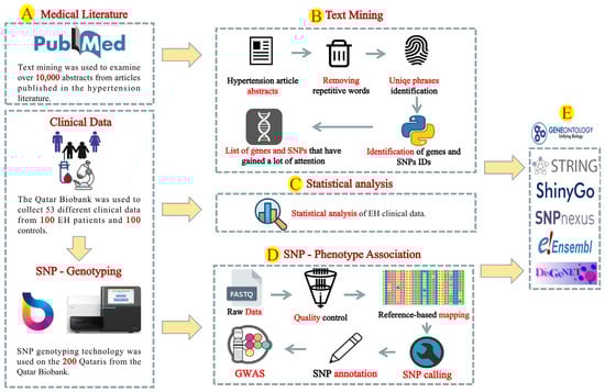 A flowchart representing the genetic resources and bioinformatics methods used in the present research. Thousands of hypertension-related articles were reviewed, as well as the SNP genotyping of 200 Qataris with high blood pressure (A) using text mining (B), statistical analysis (C), and GWAS (D). The text mining analysis included eliminating redundant words, recognizing unique phrases, detecting genes and SNP expressions, and categorizing these genes and SNPs based on their prevalence and redundancy (B). Fifty-three different clinical data of the studied patients were retrieved from QBB and used for statistical analysis (C). The SNP genotyping data were analyzed using a quality control method before being aligned/mapped to the human genome, where discovered SNPs were annotated and their association with high blood pressure was investigated using GWAS analysis (D). The details obtained from text mining and GWAS analysis was analyzed using gene ontology and enrichment analyses (E).