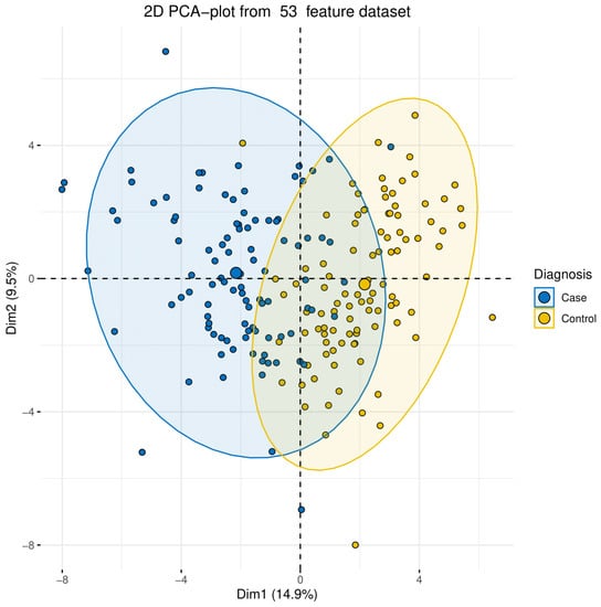 The principal component analysis of hypertension data. The PCA analysis of the 200 Qataris clustering based on 53 different clinical parameters, including blood pressure measurements.