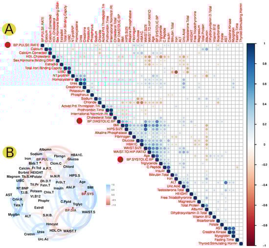 The statistical correlation analysis of hypertension data. The correlation analysis of different clinical parameters from the 200 Qataris obtained from QBB, with blood pressure parameters highlighted in red circles. (A) Graph of a correlation matrix showing positive and negative correlations with significance indicated by p values less than 0.01. (B) A correlation network graph displaying the statistical interaction between various clinical parameters, including blood pressure factors in red.