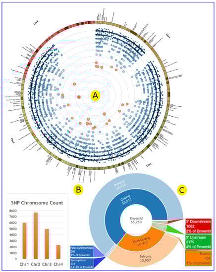 The chromosomal distribution of the identified SNPs and their association scores with EH. The colored small circles represent SNPs’ location on the human genome and their hypertension association score (−log10 of p value) according to the Fisher’s exact test. Blue and small circles represent non-significant SNPs, while large and red circles represent significant SNPs (A). The number of SNPs according to human chromosome (B). Predicted functional consequences. SNPs are classified into several groups based on their location in and effect on gene structures, which include coding and non-coding regions according to different databases (C).