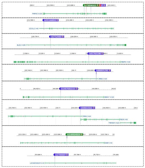 The correlations between allele count (AC), Fisher’s exact test (FET), genic region, and allele frequency are plotted in Figure 5. This correlation is important to reveal any potential misinterpretation of the genetic association with EH and visually demonstrate the potential impact of each genetic variation feature on SNP association with EH manifestation. Furthermore, examining the relationship between genetic variation components and EH may reveal previously unknown parameters that could be used in future EH genetic research to increase the number of significant SNPs. Mostly, smaller numbers of SNPs with higher FET have more AC and AF, which could indicate their importance in EH. SNPs with FET ≥ 4 are located in the intergenic region (20 SNPs), intron variant (10 SNPs), intragenic variant (5 SNPs), and upstream gene variant (3 SNPs) (Figure 5, Table 1 and Supplementary S4). The FET analysis revealed 336 SNPs with ≥3 log-p value, 38 SNPs with ≥4 log-p value, and 2 SNPs (rs921932379 and rs113688672) with ≥5 log-p value (located within regions of GMPS-SETP14 and ISCA1P6-AC012451.1 genes) (Figure 4, Table 1, and Supplementary S4). These SNPs are near/adjoined to 215 genes (Figure 5 and Figure 6 and Supplementary S5), and the SNPs’ distribution across the gene structure can be seen in Figure 5 and Figure 6.