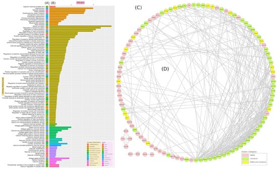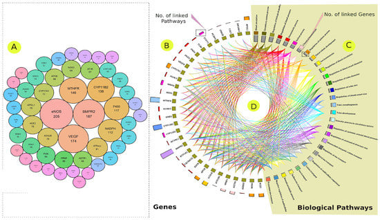 The most frequently mentioned genes in the hypertension literature (A,B). The size of the circle, as well as the numbers included, represent the number of articles that mentioned a genetic link between these genes and EH disorder (A). The most frequently mentioned genes in the hypertension literature and their corresponding biological processes according to the enrichment analysis (C). The histogram depicts the number of hypertension publications that listed these genes (A,B). Biological processes were allocated to hypertension-associated genes (C), with gray bars representing the number of genes found within these processes and colored connections representing genes that contribute to these processes. A colored link is shown between the biological process and the corresponding EH-linked genes, with each gene potentially linked to multiple pathways or vice versa (D).