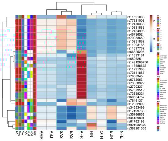 To study the frequency of the SNPs identified through our GWAS with ≥3 log-p value in different ethnic populations, we screened our associated SNPs in EUR, SAS, AFR, AMR, ASJ, EAS, FIN, NFE, and OTH populations (Figure 11 and Supplementary S9). The clustering analysis of SNPs’ frequency across different ethnic groups demonstrated high frequency for the minor alleles, especially in AFR, EAS, and SAS populations. For instance, rs1004840 shows a high-frequency rate of 0.24 for the minor allele (T) in the AFR population compared to the major allele (C:0.76) (Supplementary S9). Additionally, the clustering analysis using EH-associated SNPs revealed some consistency for SNP clustering depending on the p values, AC, overlapped gene (OG), nearest upstream gene (NUG), and nearest downstream gene. Furthermore, a high number of EH-SNPs (rs11591086, rs77321003, rs12470336, rs10931883, rs12464998, rs4673652, rs79953652, rs10931882, rs11903185, and rs11897782) have separated the populations of AMR, ASJ, SAS, and EAS with high frequencies for the major allele (Figure 11). These SNPs are located near the SPATS2L (nine SNPs) and MATN1 (one SNP).