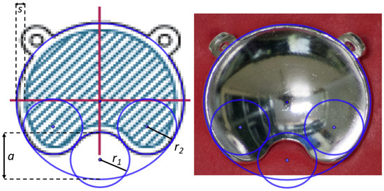 Plaque Simulator diagram of the COC plaque with the superposition of the circles that parameterize the cutout with the parameter values corresponding to the modified geometry.