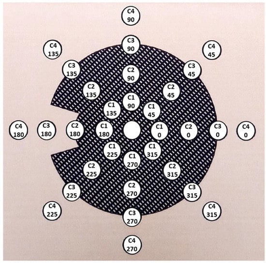 Information about the coordinates of the surface measurement points was provided by BEBIG after request. Recently, this information has been included in the calibration certificates. The measurement points are placed at 33 positions distributed on 4 concentric circles, each at 1.0 mm distance from the plaque’s inner surface. In each circle, 8 measurement points are distributed with a 45° angular separation. We labeled the points as shown in Figure 2, which depicts a scheme of the positions of the surface measurement points.