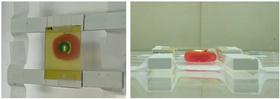 We adopted the practical method described by Hermida-López et al. [27] distributions in water produced by Ru ophthalmic applicators using EBT3 radiochromic films. A mold was made for each type of asymmetric plaque using dummy plaques and polymer clay. The mold with the plaque is to be placed inside a small water tank. A structure built with Solid Water® (Sun Nuclear Corp. Melbourne, FL, USA) pieces allows us to locate a radiochromic film piece over the plaque in a plane perpendicular to its CAX. Figure 3 shows a zenithal and a lateral view of the experimental setup.
