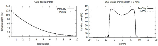 Comparison of central-axis depth profiles (left panel) and 3 mm depth lateral profiles (right panel) for a CCD plaque simulated with TOPAS and PenEasy. Dose values are normalized to 1 mm depth.