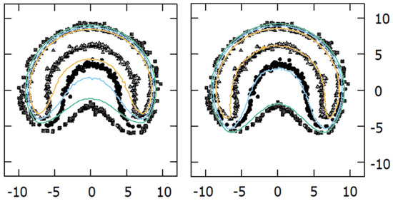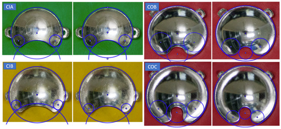 Figure 5 shows how the tuned-up values for the geometric parameters fit, in general, better than the official values to the real shape of the notch. The plaque showing the smallest discrepancy with the official parameters is the CIA, while the largest discrepancies are obtained for the COC. The optimal values found for the notch parameters, a, r1, and r2 for each plaque are reported in Table 3.