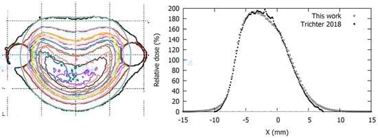 The comparison of the CIA calculations to the film measurements presented by Trichter et al. [10] also showed better agreement for the modified geometric model. In the left panel of Figure 7 our isodose distribution is overlaid on the one presented by Trichter et al. [10]. A good coincidence of the isodose lines was observed, except in the regions close to the lateral circles, which correspond to the cutouts in the film made to be inserted into the phantom. It is well known that cutting the films produces stress within the active layer close to the edge that affects its response [30] so the experimental values in these bordering regions cannot be considered. The lateral profiles represented on the right panel correspond to the central vertical axis of the dose planes from the left panel.