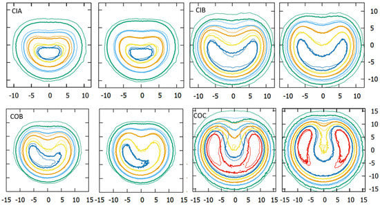 Isodose distribution comparisons, at depths reported in Table 2, for each plaque type between film measurements (thin lines) and MC calculations (thick lines) using the official (left image) and the modified geometry (right image). Dose planes are normalized to the dose of the central point (100%). Isodose levels represented for each plaque measurement are: 110%, 100%, 70%, 40%, and 10% for the CIA, 130%, 100%, 60%, 30%, and 10% for the CIB, 120%, 100%, 60%, 30%, and 10% for the COB and 200%, 140%, 100%, 60%, 30%, and 10% for the COC plaque. COB dose planes have a 1.5° tilt perpendicular to the notch direction. COC dose planes have a 3° tilt in the notch direction. x/y axis units are millimeters.