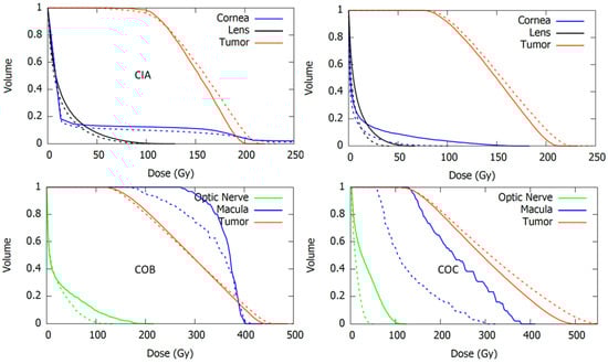 Dose-volume histogram curves for the tumor and the critical structures resulting from real clinical cases calculated with EyeMC using the official (dotted lines) and the modified (continuous lines) geometric models for the asymmetric applicators CIA (upper-left), CIB (upper-right), COB (bottom-left), and COC (bottom-right).