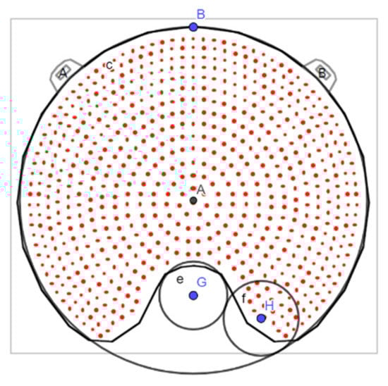 From visual inspection, we observed geometric differences in the cutout shape with respect to the diagrams of the plaques depicted in the user manual [19] and in ICRU 72 [4] (Figure 2.3 in ICRU 72). An example of this is shown in Figure 1. In order to verify this geometric characterization, we took photographs of the notched plaques available at our institution, the CIA, CIB, COB, and COC applicator models, obtaining high-quality images of the concave side of the plaques. By means of the software GeoGebra [20]—an interactive geometry, algebra, statistics, and calculus application—the different geometric forms that characterize the geometry of the asymmetric plaques were superimposed to the image of each plaque, redefining the optimal geometry to reproduce our real plaques. These geometric forms are an external circle with the diameter of the plaque, a small interior circle that defines the cutout, and two symmetric circles tangent to both the cutout and external circles that define the curvature of the notch edges.