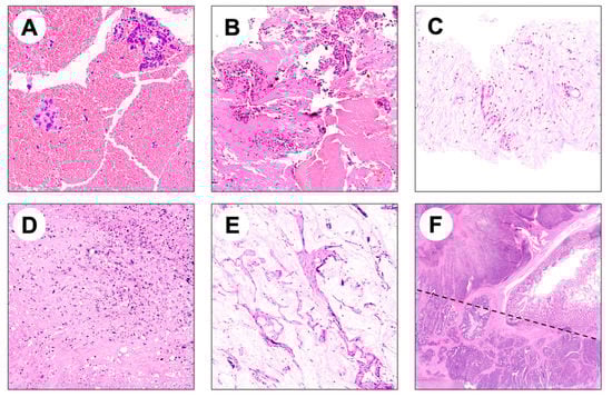 Representative images of potential pitfalls in NGS analysis of FFPE bioptic and surgical specimens. (A,B) Hematic material enclosing few adenocarcinoma glands; (C) biopsy specimen composed of fibrotic tissue enclosing rare adenocarcinoma glands; (D) scattered tumor cells surrounded by necrosis and fibrosis in a metastatic surgical resection specimen; (E) mucinous adenocarcinoma characterized by low cellularity and mucinous acellular component; (F) intratumor heterogeneity may hamper NGS analysis if both components are not considered (a morphologically heterogeneous colorectal adenocarcinoma composed by glandular and solid areas is shown).