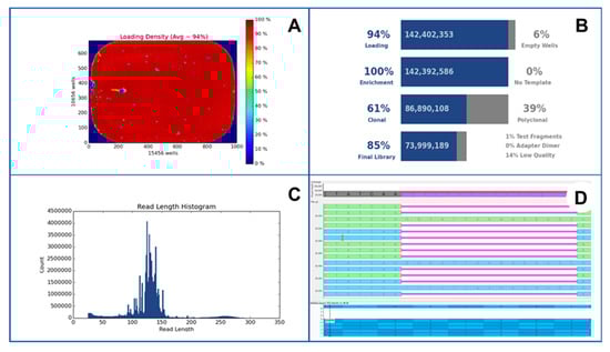 An exemplificative case of EGFR exon 19 deletion p.A746_A750 del detected by using NGS Ion Torrent S5 (Thermo Fisher Scientifics) platform. In this figure, loading density (A), technical quality parameters (B), read length histogram (C) and visual inspection of detected mutations with Golden Helix Genome Browse tool (D) were observed.