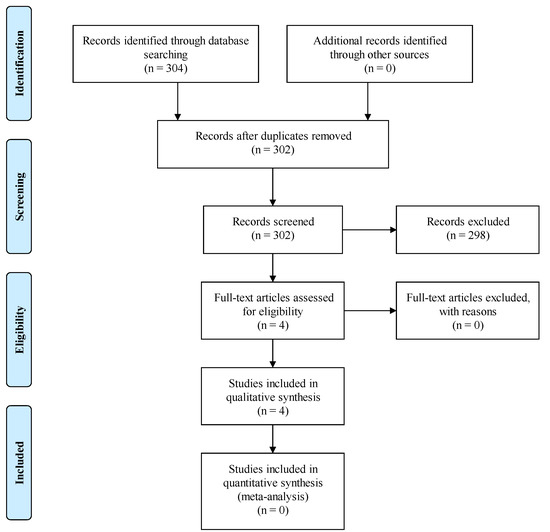An extensive literature search was performed in MEDLINE (via PubMed) in order to identify clinical studies that tried to reveal the role of SNHG15 in HCC. Keywords such as ‘HCC’, ‘hepatocellular carcinoma’, ‘SNHG15’ and ‘clinical study’ were used in our search strategy. The selection of the articles was based on PRISMA guidelines. A total number of 304 publications were identified; after the removal of duplicates, 302 remained. Following screening, 298 articles were excluded because they did not fulfill the inclusion criteria regarding the aforementioned keywords. Finally, we included 4 studies written in English and published during the period 2016–2021, in which the resected HCC specimens were studied on histopathological and genetical level. The inclusion process according to PRISMA guidelines is demonstrated in Figure 1.