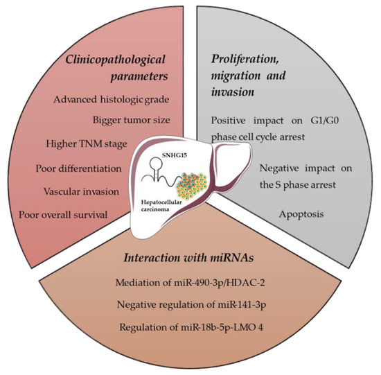 A common result that emerged from all the analyzed studies was the fact that SNHG15 was over-expressed in HCC. This fact was apparent when pairs of healthy non-cancerous tissues and specimens of liver cancer were compared with the use of RT-qPCR, but it was also evident when HCC cell lines were compared with normal liver cell lines. Apart from this, the higher expression of SNHG15 was correlated with tumors with worse pathologic and prognostic characteristics. Among 201 paired specimens of HCC and normal liver tissue, and 269 total specimens of HCC, it was found that expression of SNHG15 was significantly higher in cancerous tissues [24,30,31,32]. Furthermore, the higher expression of SNHG15 was correlated with an advanced histologic grade, higher TNM stage, vein invasion and poorer overall survival. The correlation between SNHG15 expression and overall survival was also statistically significantly independent of the other factors [24].