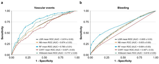 Performance of the four machine learning methods in predicting (a) vascular events and (b) bleeding.