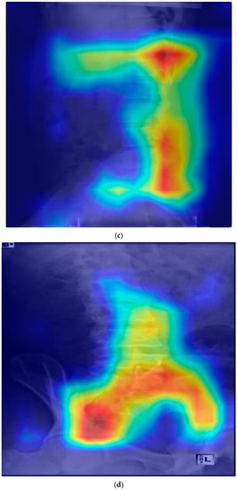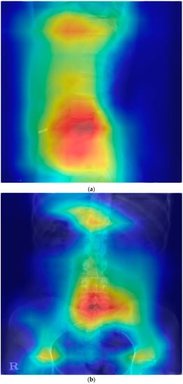 In Grad-CAM, some showed heat maps in the lumbar disk area and some showed heat maps along the lumbar vertebrae shape; however, some showed heat maps in areas not associated with HNP (Figure 1).
