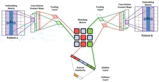 The PSN framework offers reliable, generalizable classifiers that can integrate heterogeneous data and intuitively manage missing information [5]. Table 1 presents some approaches that have been adopted for building patient similarity, including neural networks. DL [9] is an end-to-end deep similarity learning technique that simultaneously learns patient representations and determines the association between the patients using pairwise similarity probability. CNN [10] is applied to investigate the vector representation of raw EHRs and collect important information about patient attributes, and a SoftMax-based supervised classification algorithm is used to discover the similarity between pairs of patients. A recent study [8] proposed a DL architecture (CNN) to evaluate patient similarity based on the temporal matching of patient EHRs represented via medical concept embedding. The similarity between two patients is calculated from the temporal representation, where the records of each patient p are represented as a matrix X, with dimension d × Np, where d is the dimension and Np is the total number of hospital visits for patient p.