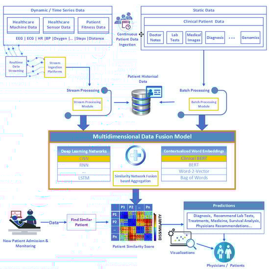 Data stream processing engines, such as Spark Streaming [54], support native in-memory storage. However, others typically do not provide their own data storage mechanisms, but offer data source and sink connectors to data ingestion mechanisms, such as Kinesis, Kafka, HDFS, and Cassandra. Spark Streaming can be used to collect data streams from live sources and split the data into batches, which are further processed by the Spark engine to produce the final batch. The resulting batches of data from stream processing and the output of the batch processing module using Spark MLib or similar batch processing tools are stored in databases and utilized to train the model. DL networks can use technologies, such as Tensorflow, Keras, PyTorch, and other DL platforms and libraries, for developing the model to calculate patient similarity scores and provide prediction and visualization regarding diagnosis, treatments, and lifestyle recommendations.