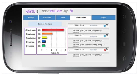 In this module, a dashboard was designed to visualize the forecast outcomes and collection of guidelines and clinical advice, including diagnosis, potential laboratory examination, and drug prescription. A prototype of the mobile app visualization dashboard, which provides a physician’s perspective of listing similar patients when a specific patient is selected (in this case, patient ID 5), is depicted in Figure 3. It also indicates the common symptoms experienced by similar patients with respect to cardiovascular disease (CVD) events and brain seizures.